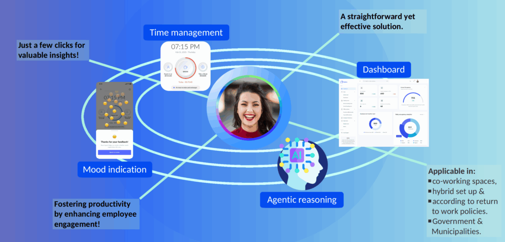 Our Hybro solution streamlines time tracking, employee counting, and meeting room bookings. This innovative technology empowers corporate managers and employees to save time and reduce costs, ultimately enhancing overall company productivity. By utilizing state-of-the-art daily employee mood indicators, regular surveys, and advanced AI reasoning, we provide valuable insights that support HR managers and leadership in making informed decisions.